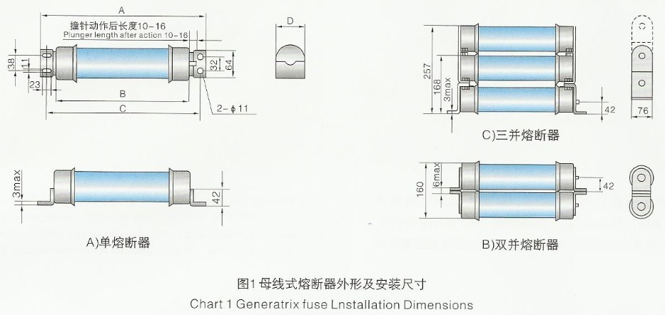 型号 | 额定电压Un(KV) | 额定电流In(A) | 直径×长度D×L(mm) | A(mm) | C(mm) | 额定开断电流(Kv) | 国外参考型号 |