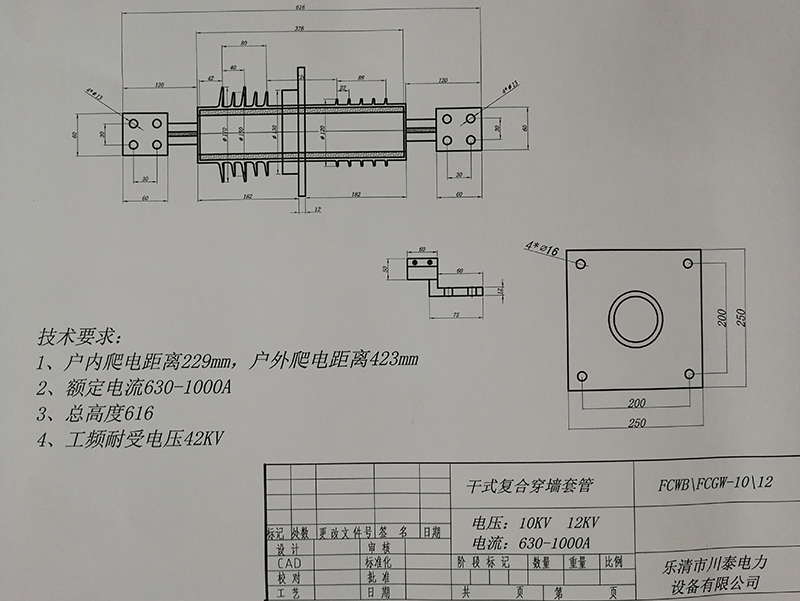复合传墙套管由圆筒导杆和紧包导杆的环氧纤层、中间法兰、及包封环氧玻纤层的硅橡胶护套和伞裙组成,中间法兰区域进行了电场均匀处理。