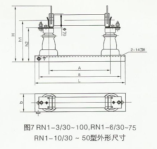 RN1,RN3型熔断器是由两个支柱绝缘子,触座,及熔丝管,座板等四部分组成。支柱绝缘子安装在座板上,触座固定在支柱绝缘子上,熔丝管则放在触座中固定,但两端的铜帽绕装在瓷管上,熔断管管内熔丝按额定电流的大小,用一根或多根熔丝绕到有棱的芯子上(额定电流小于7.5A的)或绕城螺旋形直接安装在管内(额定电流大于7.5安的)然后充填石英砂,两端铜帽用端盖压紧,用锡合牢,以保持密封。