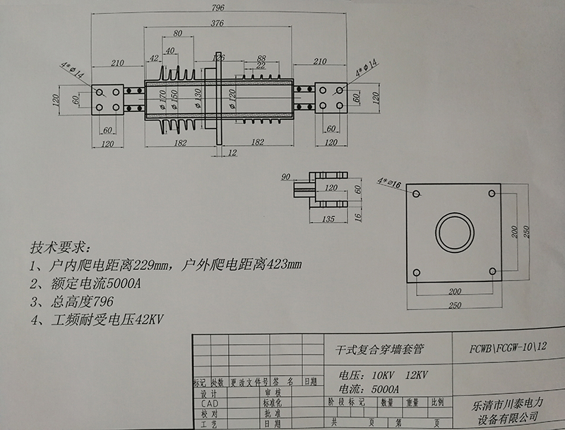 复合传墙套管由圆筒导杆和紧包导杆的环氧纤层、中间法兰、及包封环氧玻纤层的硅橡胶护套和伞裙组成,中间法兰区域进行了电场均匀处理。