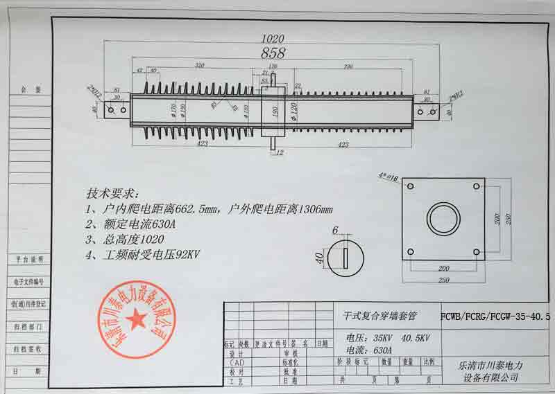 复合传墙套管由圆筒导杆和紧包导杆的环氧纤层、中间法兰、及包封环氧玻纤层的硅橡胶护套和伞裙组成,中间法兰区域进行了电场均匀处理。