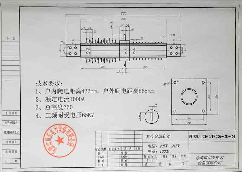复合传墙套管由圆筒导杆和紧包导杆的环氧纤层、中间法兰、及包封环氧玻纤层的硅橡胶护套和伞裙组成,中间法兰区域进行了电场均匀处理。